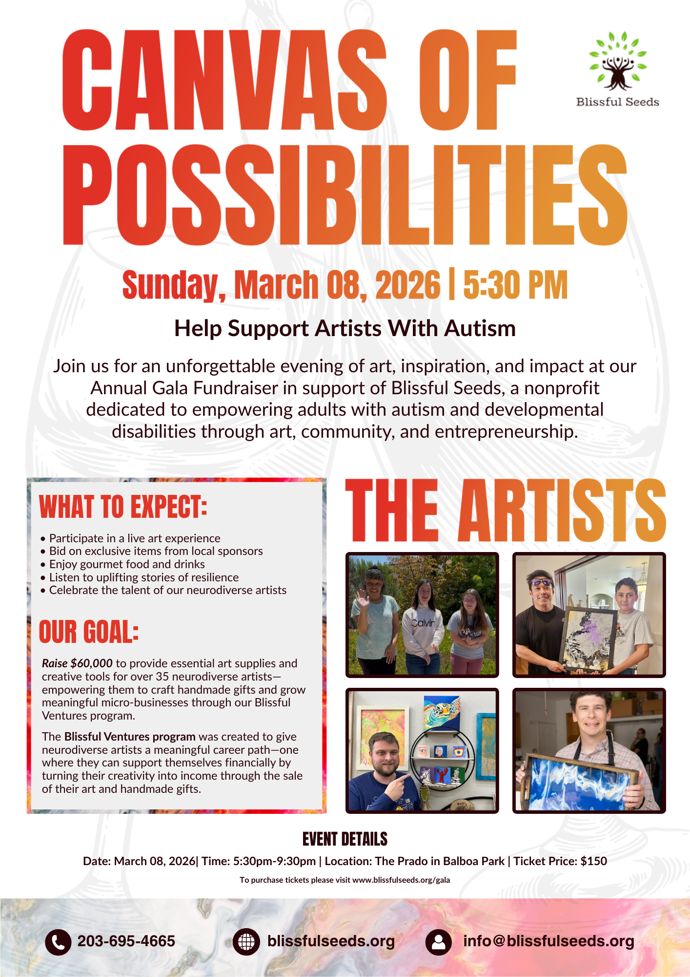 Join us for an unforgettable evening of art, inspiration, and impact at our Annual Gala Fundraiser in support of Blissful Seeds, a nonprofit dedicated to empowering adults with autism and developmental disabilities through art, community, and entrepreneurship.