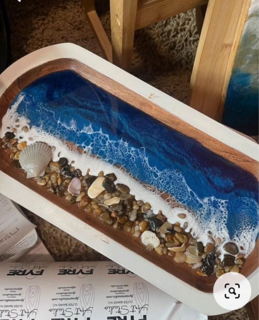 Each piece is unique and reflects the creative decisions made during the process. Resin trays are commonly used for organizing small items such as jewelry or keys, while other pieces function as decorative accents.
