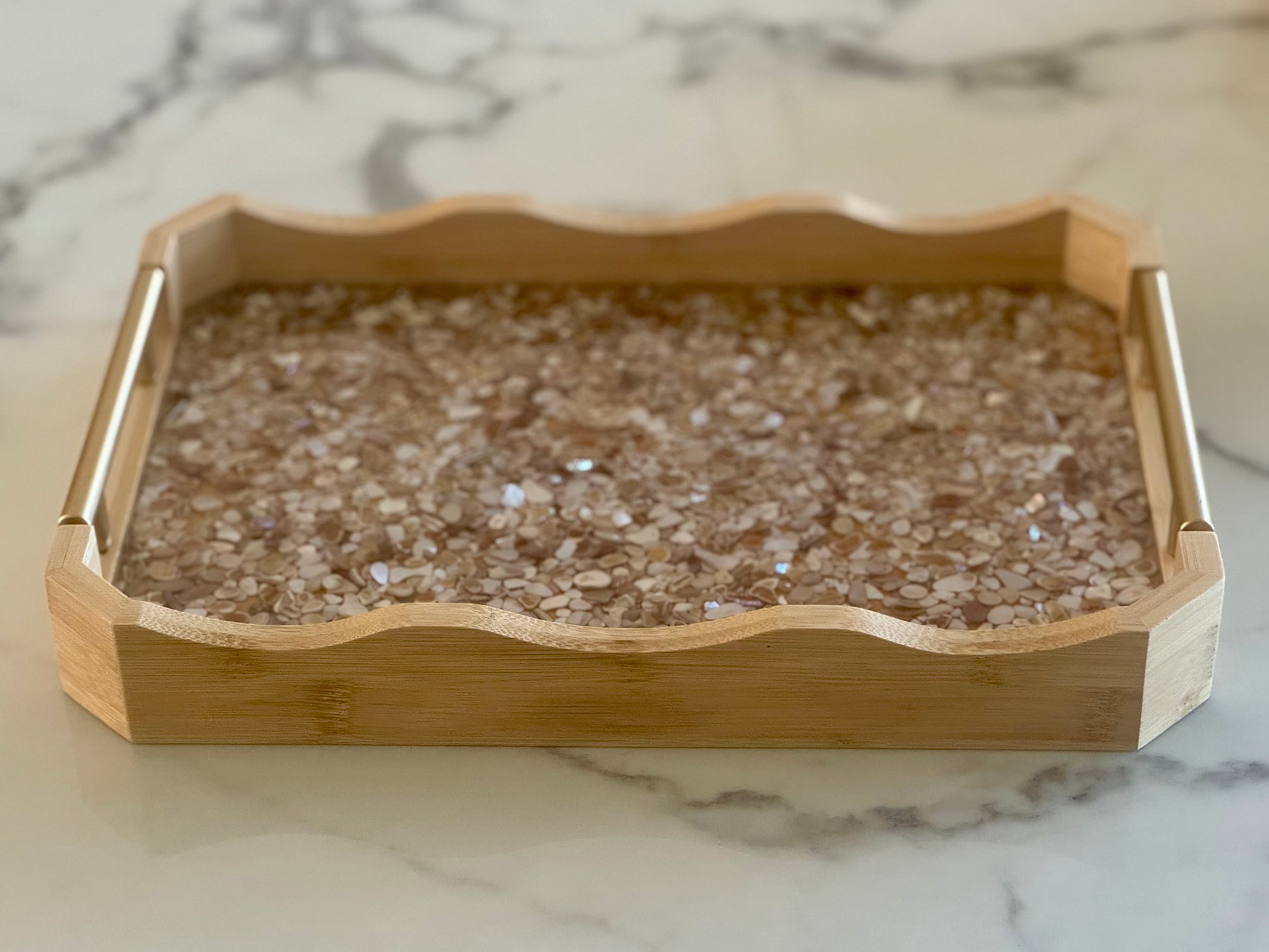 This 14.5x10 bamboo tray features elegant wavy edges and a beautiful crushed sea glass decoration, combining natural materials with refined design. Perfect for serving guests or as a stylish hostess gift, it adds a touch of sophistication to any gathering.